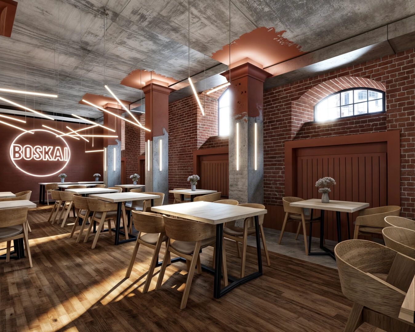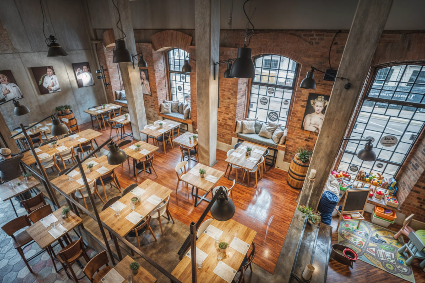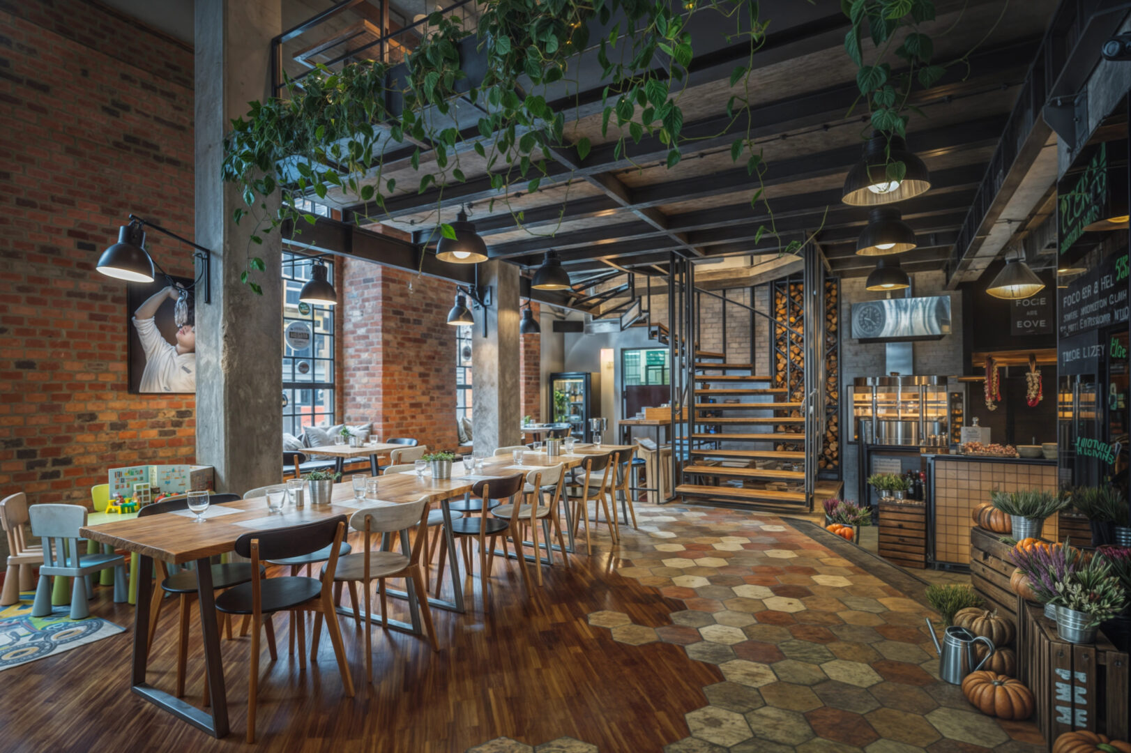 Restauracja ma aż 3 poziomy dostępne dla gości, zaczynając od sutereny przewidzianej na przyjmowanie zamkniętych wydarzeń towarzyskich, przez ogólnodostępny parter po antresolę przystosowaną do spotkań biznesowych. Wielkość lokalu zapewniła miejsce dla zaproponowania atrakcji w postaci otwartej kuchni na potrzeby przygotowywania pizzy, strefy baru oraz przestrzeni dla gości. Z szacunku dla tektoniki budynku, i jego elementów zabytkowych staraliśmy się nie konkurować wystrojem, odsłaniając naturalne materiały konstrukcyjne w postaci cegły i betonu.