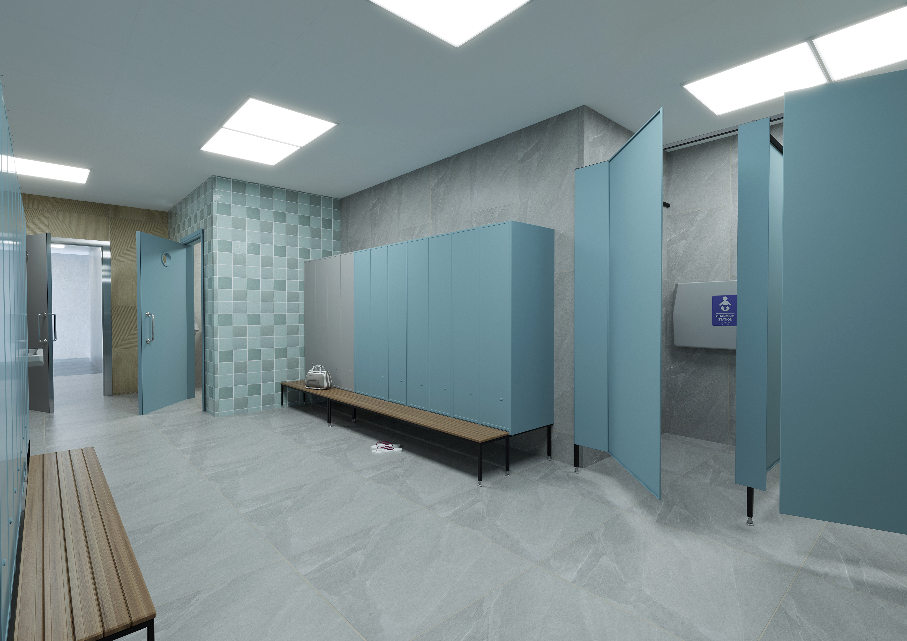 W strefie przebieralni zastosowano model kabin przechodnich z ławkami. W każdej ze stref w linii szafek umieszczono ławki z materiałów drewnopodobnych. Drzwi kabin prysznicowych wykonane zostały ze szkła dymionego, dzięki czemu są one nietransparentne.